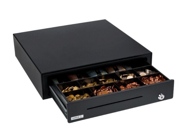 Die robuste Geldschublade für jede Anwendung. Der praktisch gestaltete Innenraum der Schublade verfügt über einen Einsatz mit 9 Münzfächern und 4 Scheinfächern sowie einem Einwurfschlitz für Belege und Bons.