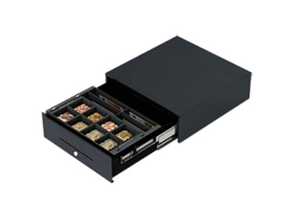 Besonders tiefe Münzbecher und Notenfächer ermöglichen die Aufbewahrung einer substanziellen Menge an Bargeld in der Geldlade, mit zusätzlichem Aufbewahrungsraum unter den Münzfächern zur Aufnahme von sonstigem POS-Zubehör. Der Bereich kann mit einer verriegelbaren Box angepasst werden.