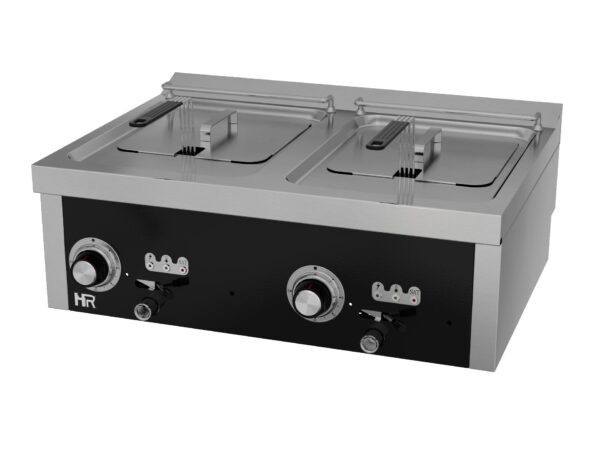 Elektrische Doppel-Fritteuse mit kompaktem Design für Theken- oder Arbeitsplatteneinsatz Ideal für Restaurants Imbisse und Foodtrucks.