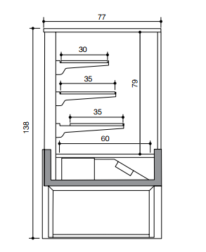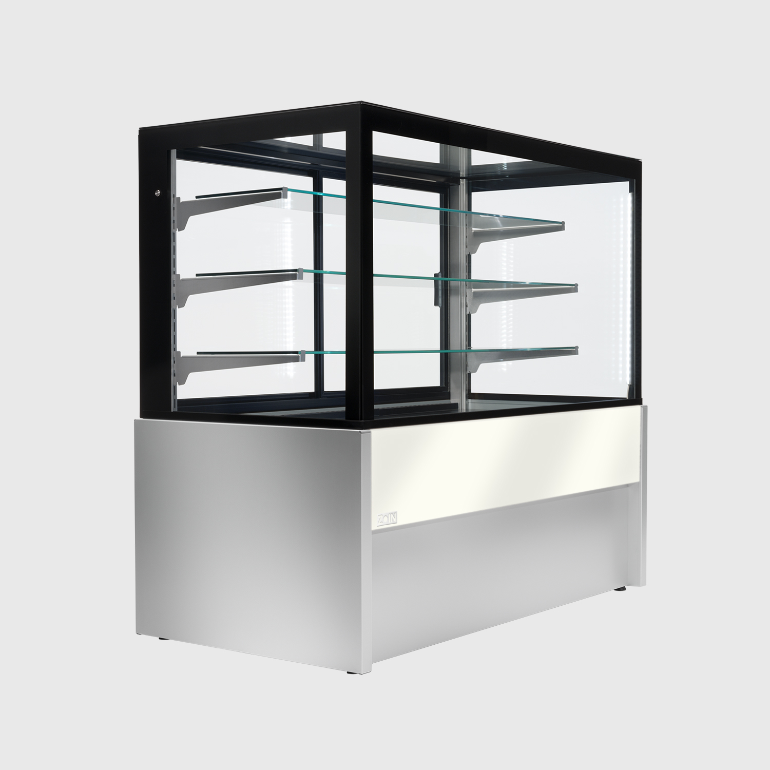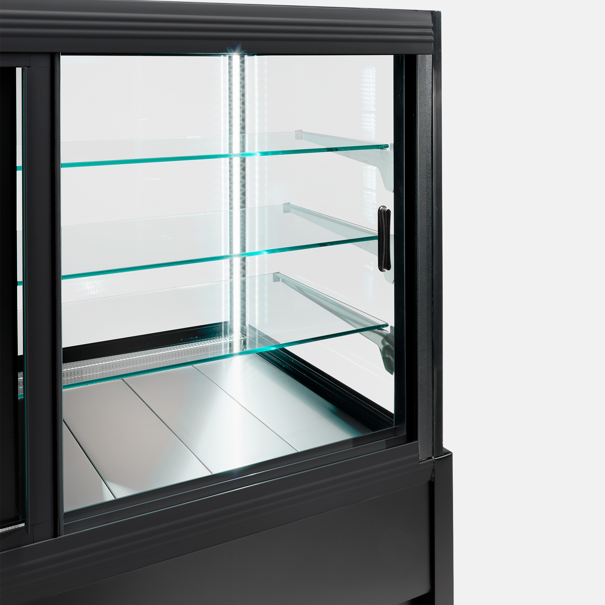 Die Vitrine verfügt über mehrere abgestufte Glasablagen mit unterschiedlichen Tiefen. Dadurch wird eine strukturierte Warenanordnung und optimale Sichtbarkeit über alle Ebenen hinweg erreicht. Der Zugriff auf die Ware erfolgt über rückseitige Schiebetüren und gewährleistet einen ergonomischen und platzsparenden Bedienbetrieb.
