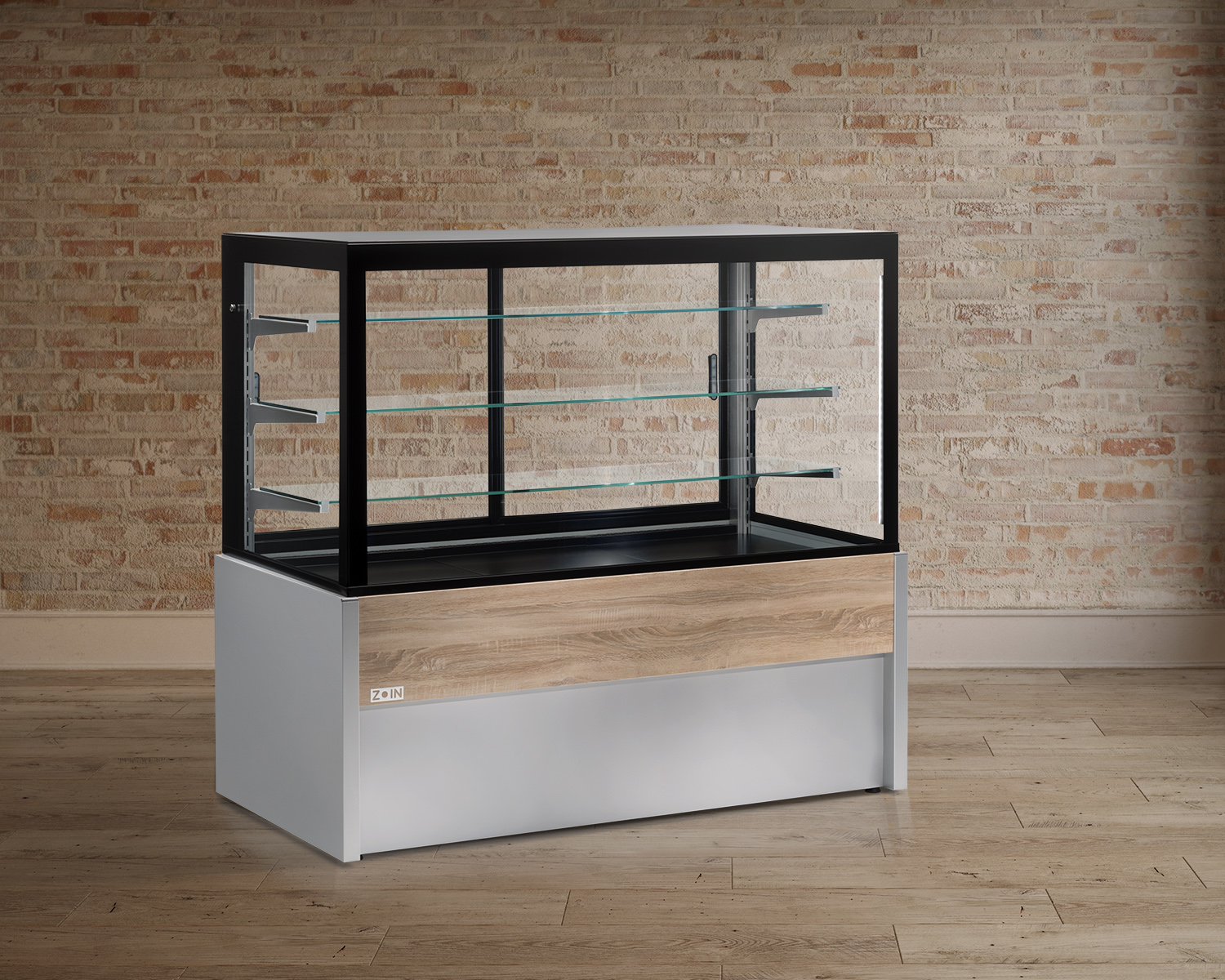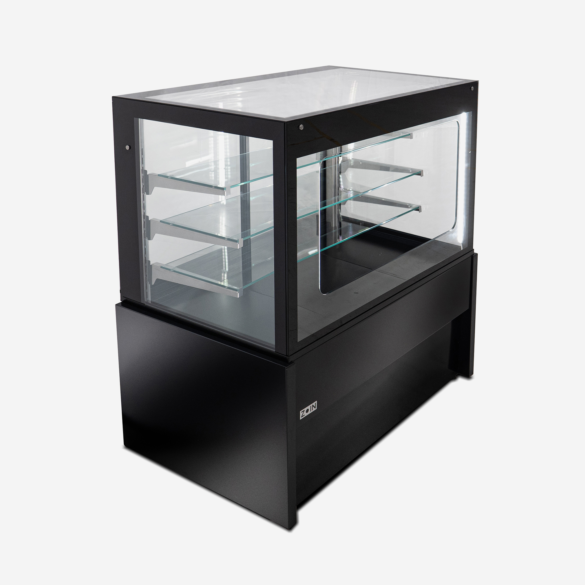 Die Verglasung besteht aus Thermopane-Glasscheiben mit schwarzer Serigraphie und ermöglicht eine klare und hochwertige Sicht auf die präsentierten Produkte. Eine vertikale LED-Beleuchtung sorgt für eine gleichmäßige und effiziente Ausleuchtung aller Präsentationsebenen.