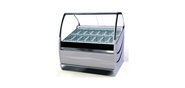Eisvitrine „Rotonda“ für 24 Bleche 230x120x130 mit Luftzirkulation – LED – Dekoration
