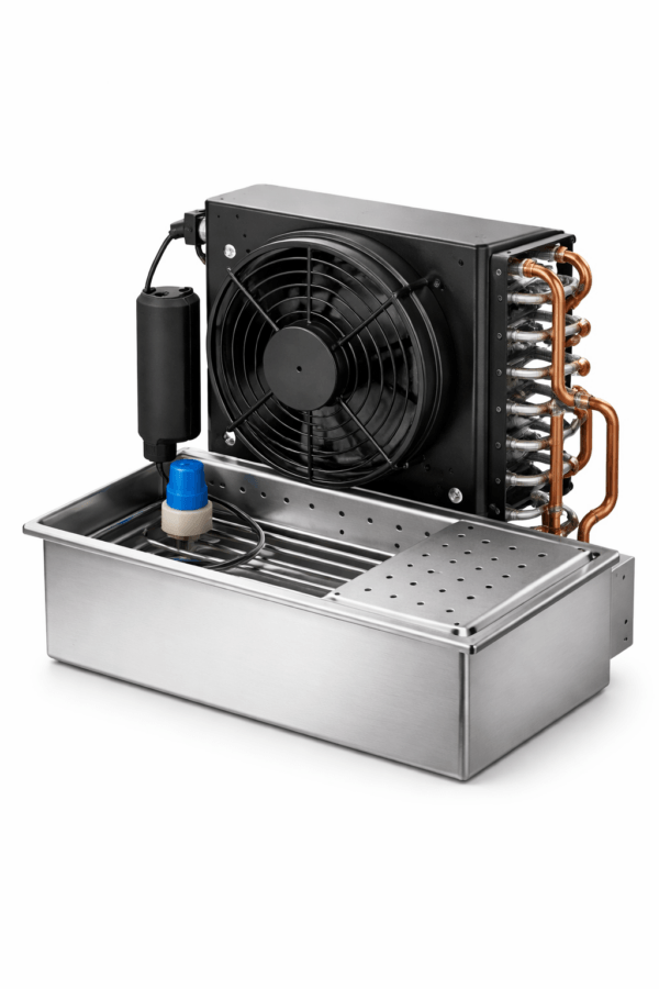 Der integrierte Auffangbehälter dient zur Sammlung des beim Kühlprozess entstehenden Kondensats und unterstützt einen sauberen, wartungsarmen Betrieb. Die Baugruppe ist für den professionellen Einsatz im gewerblichen Kühltechnikbereich ausgelegt.