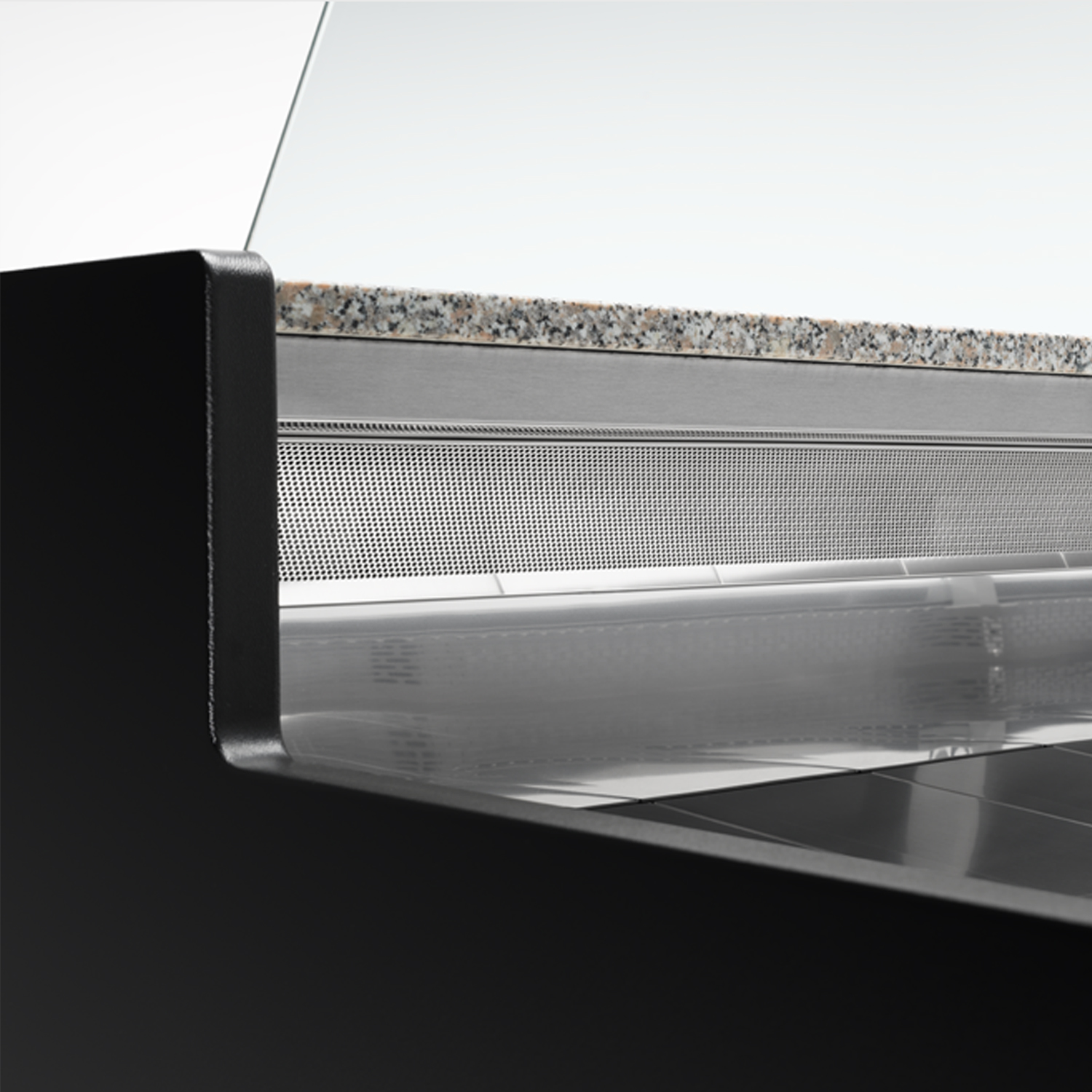Die Frontverglasung besteht aus nach oben öffnenden Glasscheiben (Hubglassystem). Diese Bauart ermöglicht einen ergonomischen Zugriff auf die Auslagefläche, erleichtert das Bestücken sowie die tägliche Reinigung und reduziert den Platzbedarf im Bedienbereich.
